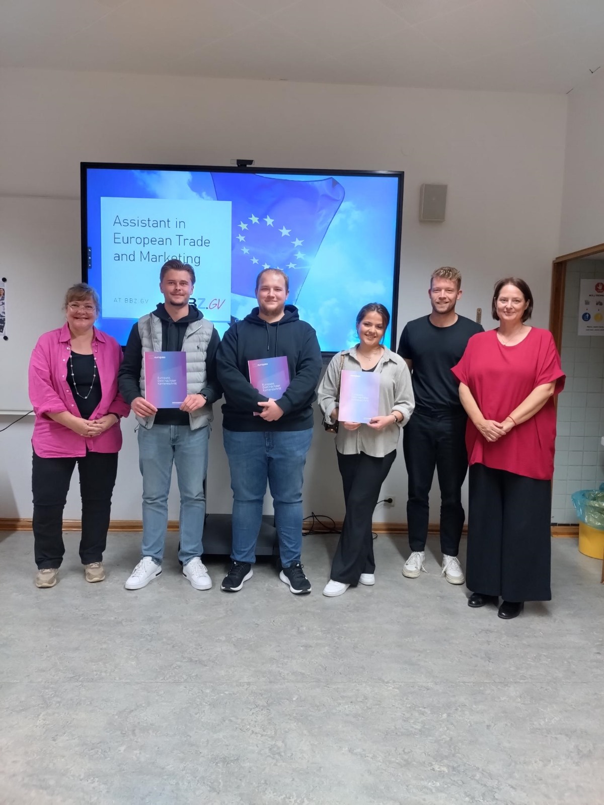 Drei Auszubildende der Mittelstufe im Großhandel dürfen sich nun "Europakaufleute" nennen. Rinora Azizaj, Mathis Kapschak und Elias Maksim Jakovski (alle aus der GAK24A) feierten am 24.9. einen wichtigen Meilenstein: sie hielten ihre englische Abschlusspräsentation zur Zusatzqualifikation "Europakaufmann/kauffrau".