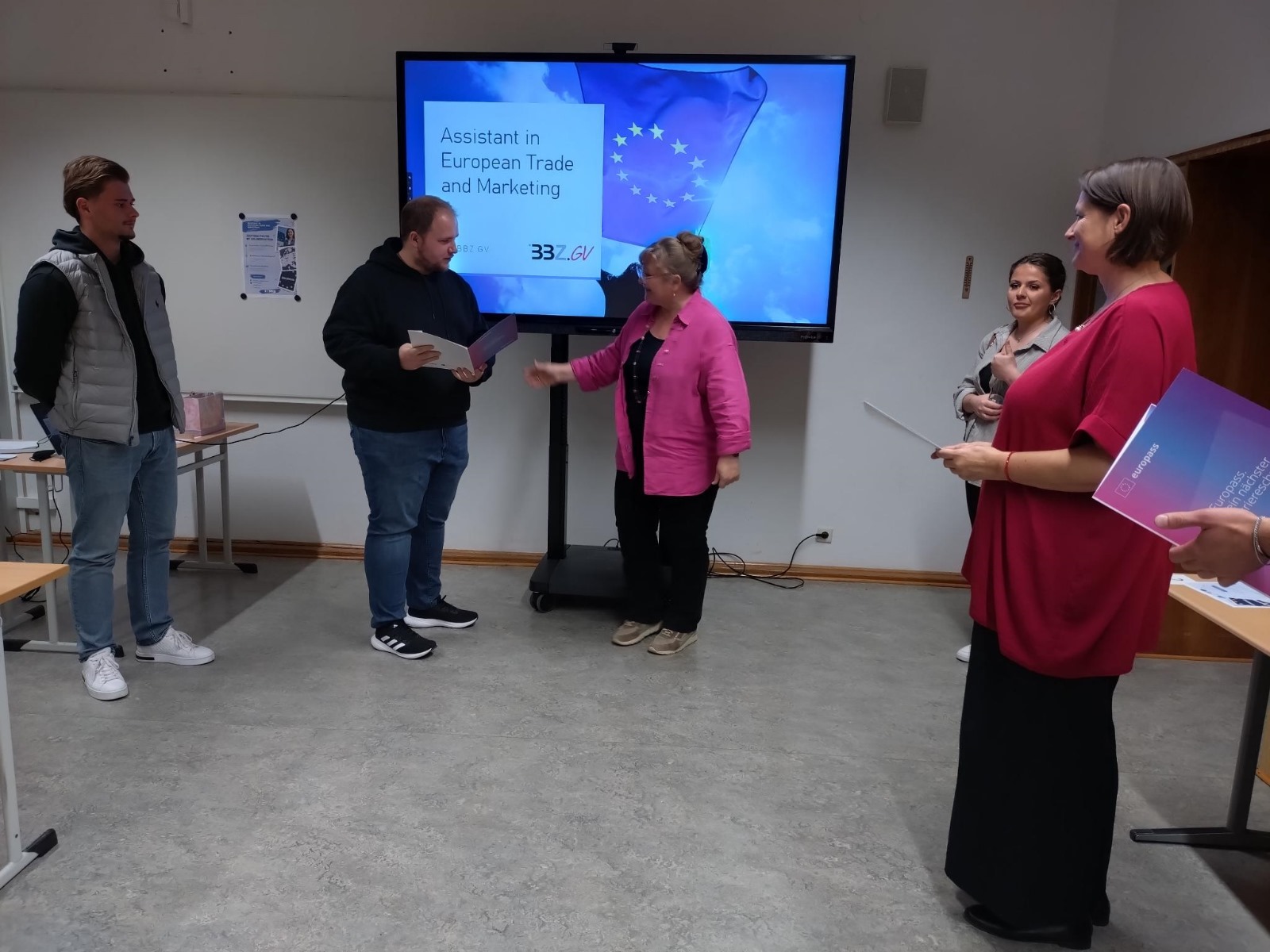 Drei Auszubildende der Mittelstufe im Großhandel dürfen sich nun "Europakaufleute" nennen. Rinora Azizaj, Mathis Kapschak und Elias Maksim Jakovski (alle aus der GAK24A) feierten am 24.9. einen wichtigen Meilenstein: sie hielten ihre englische Abschlusspräsentation zur Zusatzqualifikation "Europakaufmann/kauffrau".